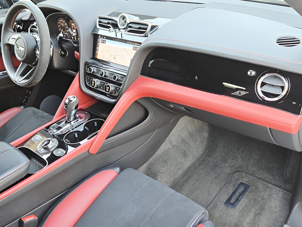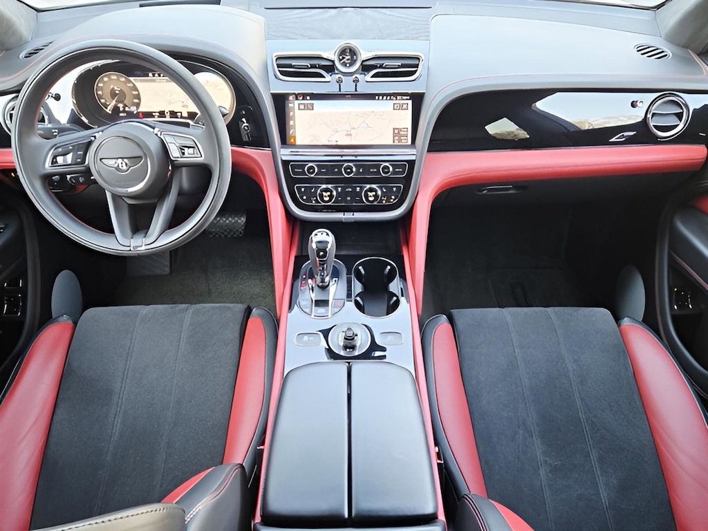 Inside, the cabin is a stunning contrast of **Hotspur red main hide** and **Beluga black secondary hide**, creating a sporty yet luxurious atmosphere. Detailed with contrast stitching, embroidered Bentley emblems, and refined **Piano Black veneers**, every element reflects Bentleys commitment to craftsmanship. The **Alcantara-trimmed steering wheel** and illuminated S treadplates further emphasize its performance-inspired character.